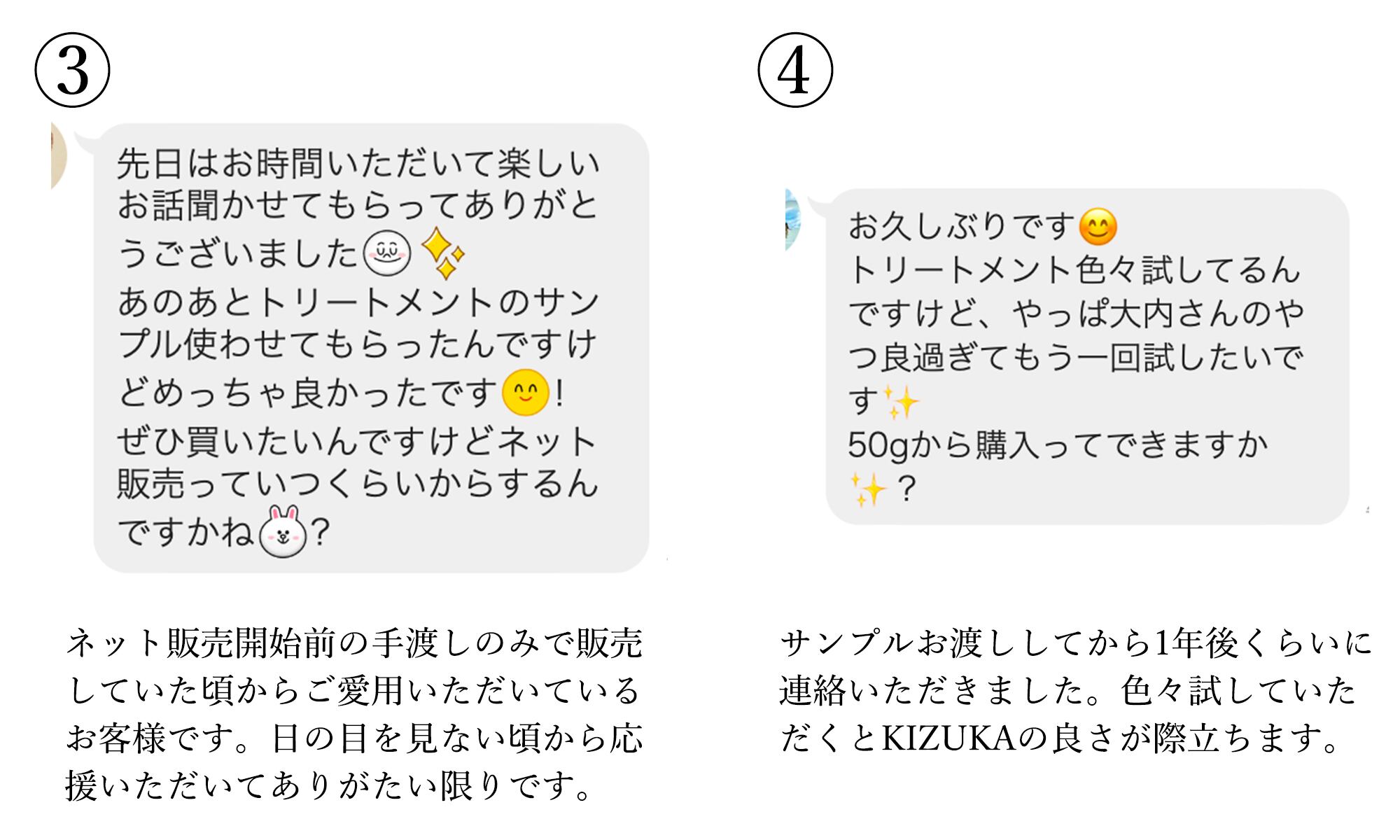 全く別人のお腹の写真を載せて「痩せました!」というダイエット商材、施術直後の写真を載せて「2ヶ月もサラサラキープ!」というヘアケア商材、美容業界はヤラセが横行しています。定期購入させて解約を防ぐために平日の電話のみの受付にする。モノに自信がないから売れるためにセコいことをするナンセンスな商売は絶対しません。KIZUKAに絶対の自信があるからです。